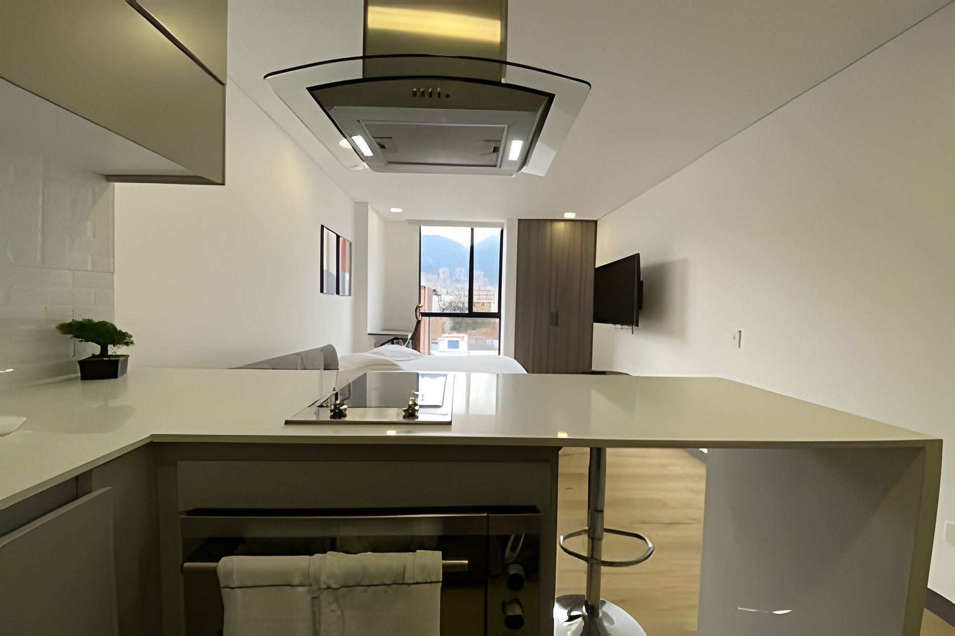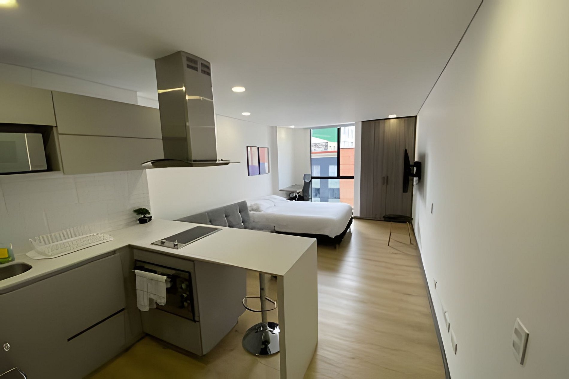 Fully furnished loft-style apartment, ideal for comfortable and functional stays. Features a fully equipped kitchen, in-unit washer and dryer, private bathroom, queen-size bed, TV, and high-speed internet. Located in the Galerías neighborhood, just steps from El Campín Stadium, universities, and shopping areas.