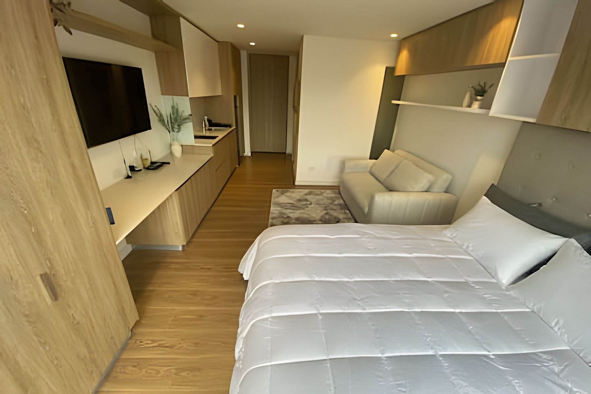 El apartamento es tipo Loft, tiene una cama doble, cocina, un baño, sala y una terraza amplia.
